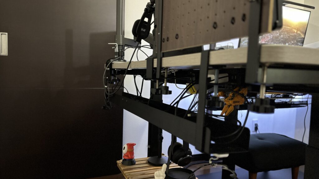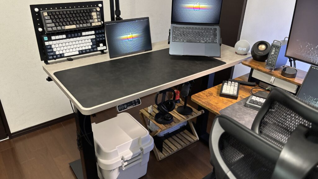ボタンひとつで58〜123cmの範囲でデスクの高さをスーッと変えられる電動昇降デスク。立って作業したい時はもちろん、配線整理するときにグイーンと高さを上げられるのが地味に便利なんです。