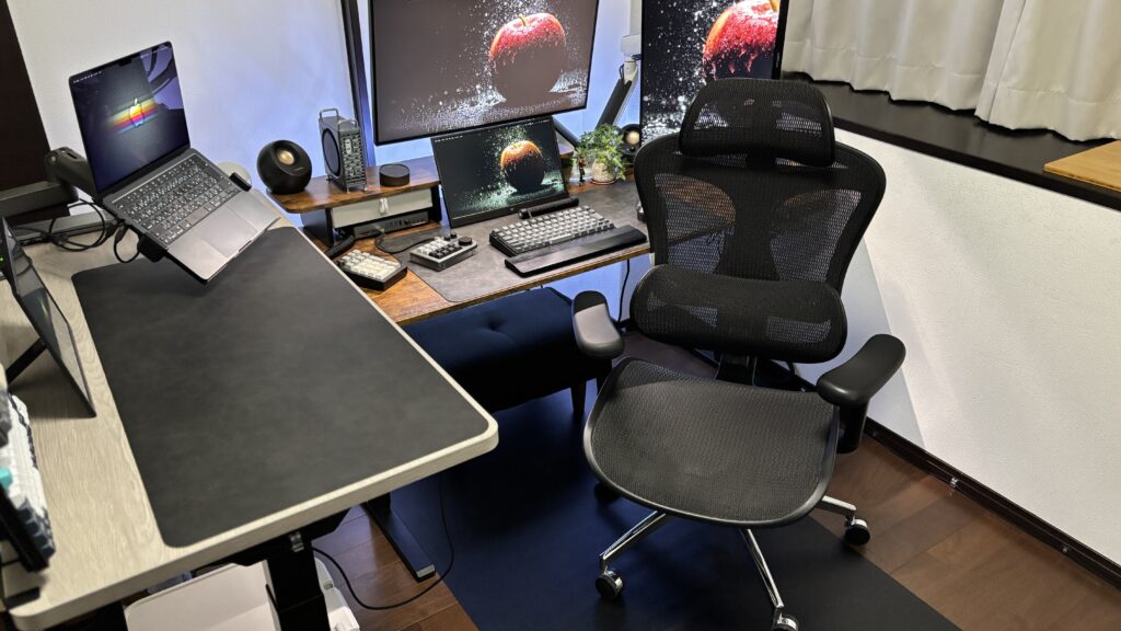 メッシュ素材で少しなら形状が変化するから、モニターアームなどのクランプと干渉してもなんとかなるところが好き。位置の移動も簡単にできるので、デスクのレイアウト変更にも柔軟に対応できる。