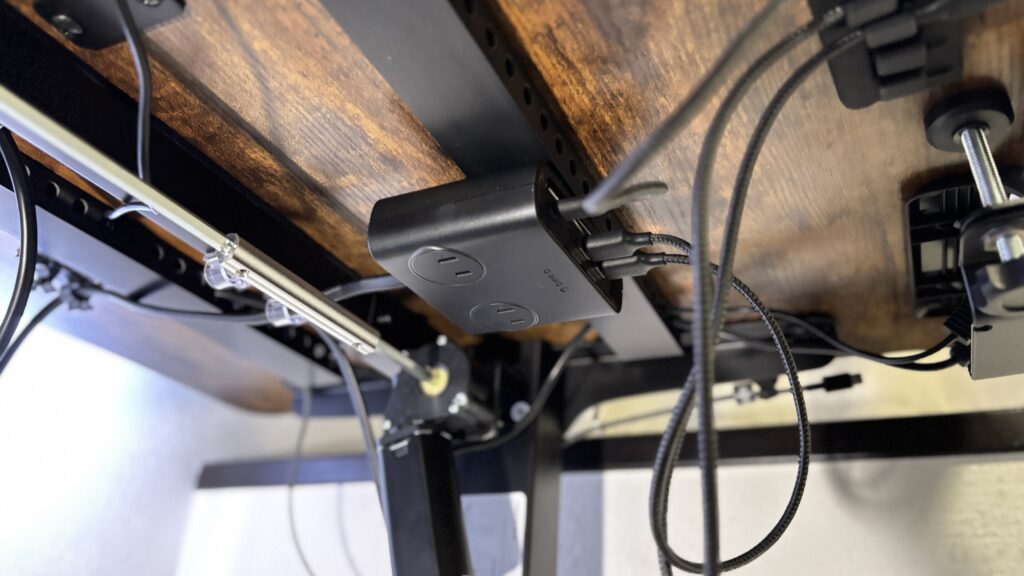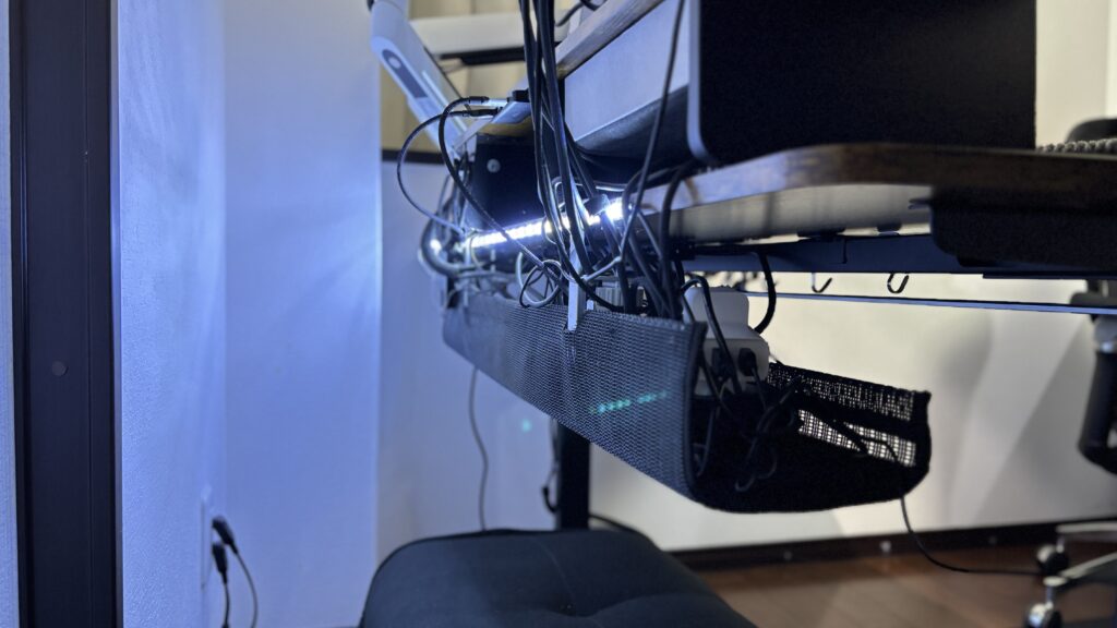設置が超簡単なメッシュタイプのケーブルトレー。クランプでカチッと挟むだけで取り付け完了。幅90cmで収納力も高いし、電源タップやアダプタがまるっと収まる。