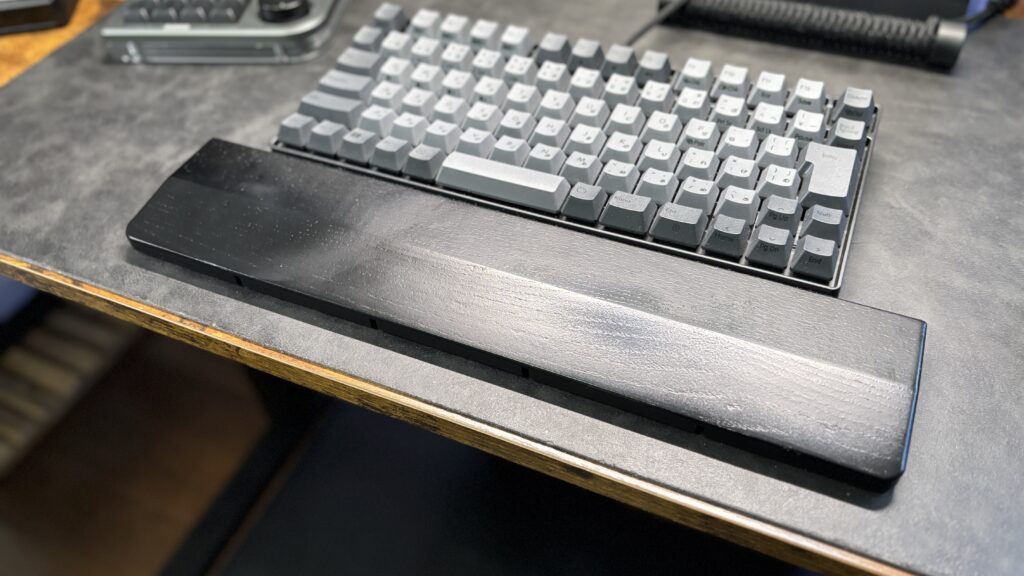 見た目の高級感がハンパない木製リストレスト。漆塗りの光沢がデスクの上でキラリと映えて、所有欲を満たしてくれる。