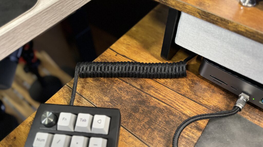 有線キーボードを使い出して、見た目を悪くせずに接続するために購入したコイルケーブル。クルクルと巻かれたケーブルがデスクの上でいい雰囲気を出してくれる。