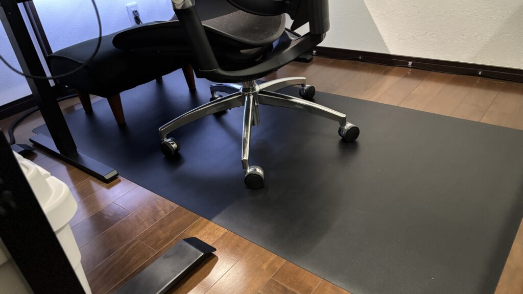 デスクの幅より大きめのサイズを選んだことで、イスが動く範囲をしっかりカバーできている。1.5mm厚で段差も少なく、キャスターの動きもスムーズ。