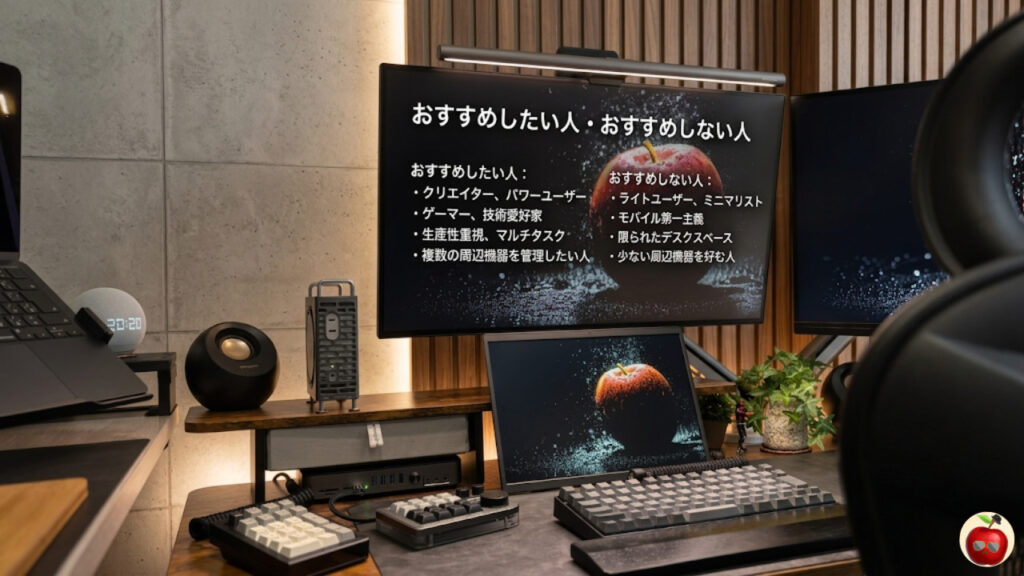それでも使い続けているのは、「このベゼルレス+前面ロゴなしのデザインが自分のデスクに合っている」という一点。デスク環境にこだわりを持てる人なら、その感覚が作業のモチベーションにもつながります。