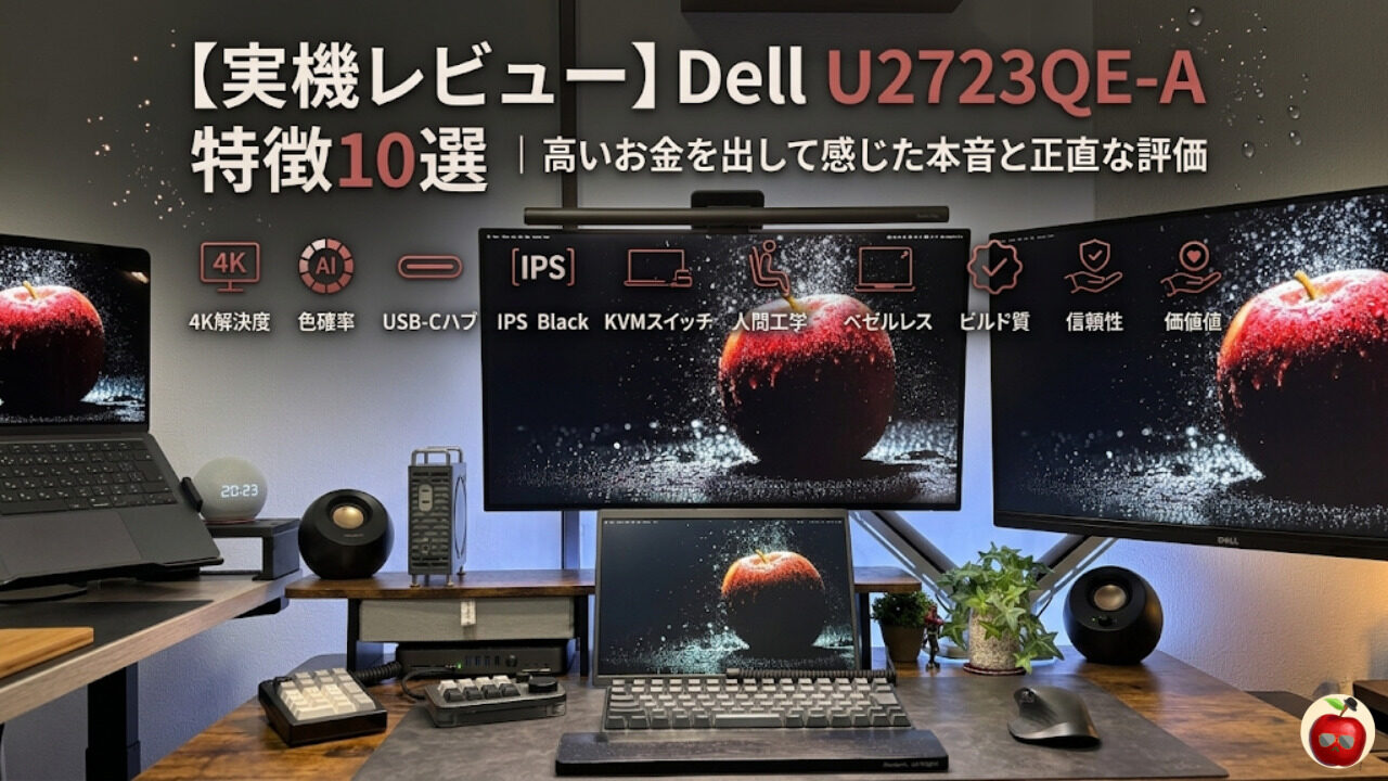 デスク周りをスッキリさせたい、作業効率を上げたい──そんな思いで愛用しているメインモニターが「Dell U2723QE-A」です。IPS Blackパネルが生み出す圧倒的な黒の深みと、前面ロゴのない4辺ベゼルレスデザイン。MacBookとケーブル1本でつながる快適さも含めて、実際に使い込んで感じた特徴10選を本音でお届けします。