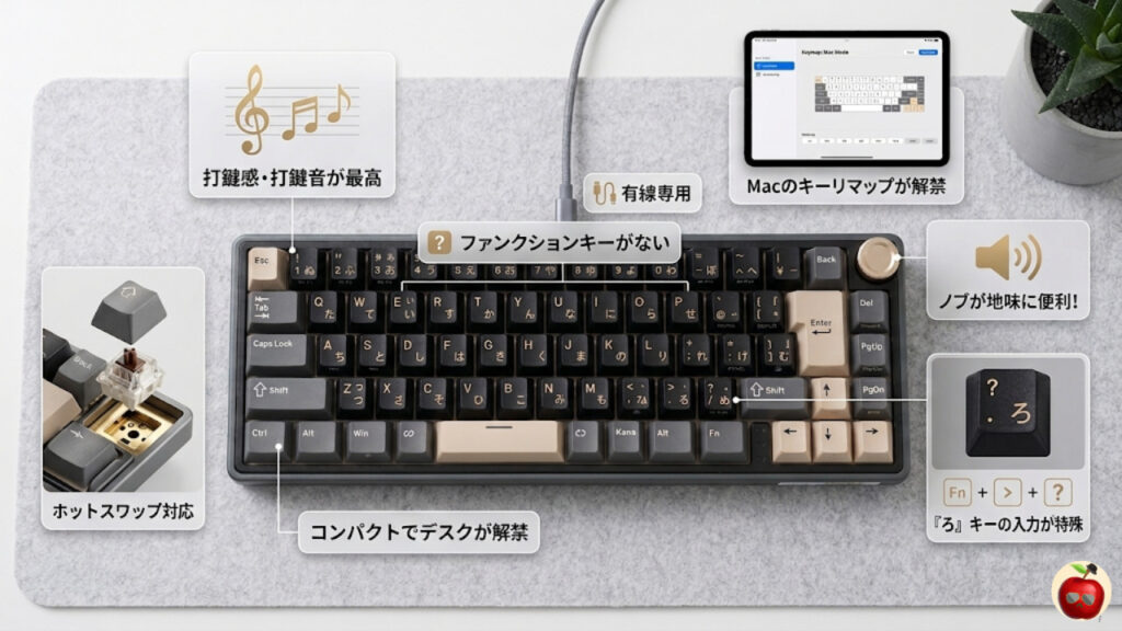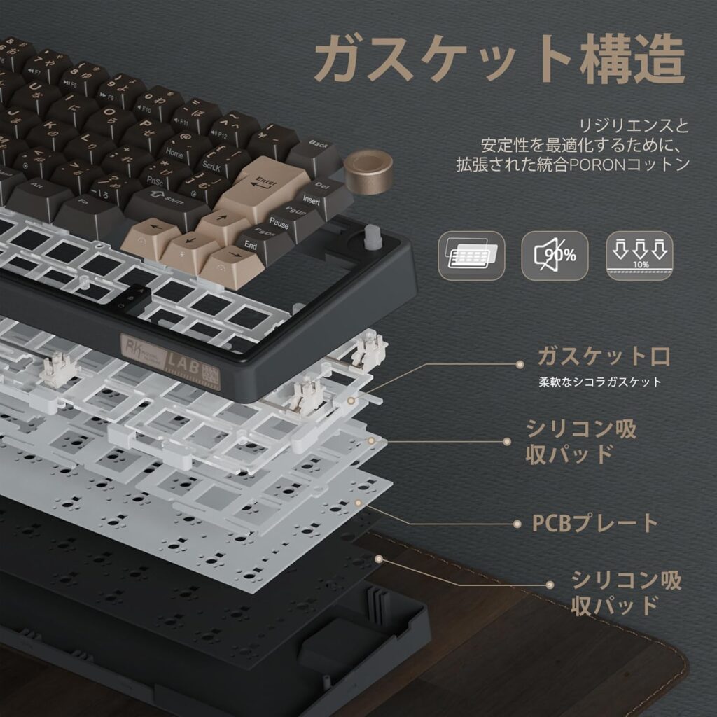 キーを叩くたびに響く「コトコト…」という極上の音を生み出すガスケットマウント構造。好みのキースイッチやキーキャップに交換できるホットスワップ対応。さらに、デスクワークで重宝するノブや、自由なキーマッピング機能まで、この価格帯とは思えないほどロマン機能が詰め込まれています。