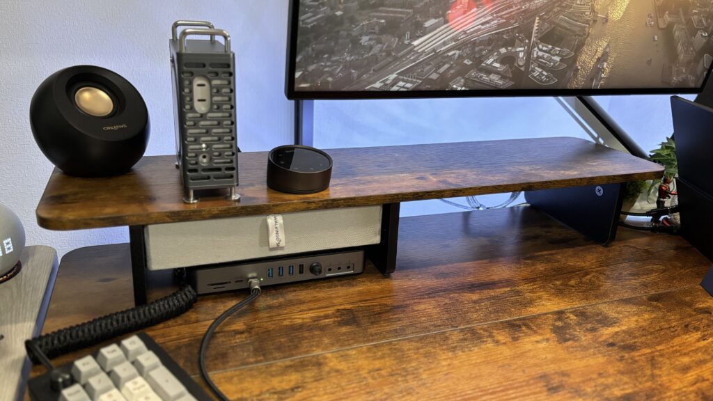 憧れだったシェルフが付属しており、パソコンやスピーカーを置いたり、ドッキングステーションや配線を隠すことができます。モニターを設置するスペースにもなりますし、高い位置にセットすることもできるなど、使い方に幅がでます。