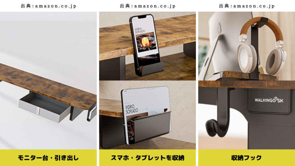 一般的な電動昇降デスクでは別途モニタースタンドやシェルフを購入する必要がありますが、WALKINGDESKは最初から一体化されているため、追加出費を抑えられます。