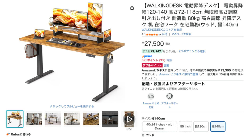 FlexiSpotの上位モデル(E7・E7Hなど)は4〜6万円台が中心で、天板込みだとさらに高くなります。一方、WALKINGDESKは天板・シェルフ・小物入れ込みで約27,500円。