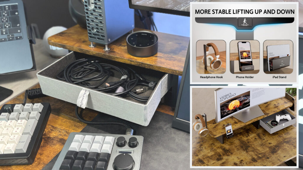 FlexiSpotなどの定番ブランドでは、モニタースタンドやフックは別途購入する必要があるケースが多いので、「デスク一台でデスク周りの収納まで完結させたい」という方にはかなり魅力的な構成です。